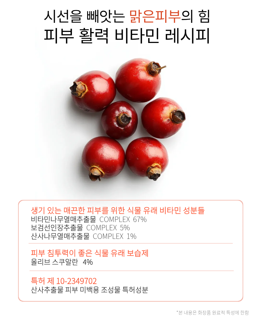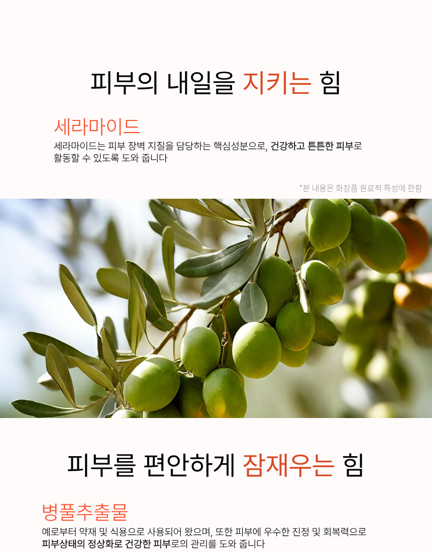 정제수, 부틸렌글라이콜, 글리세린, 스쿠알란, 메틸글루세스-20, 나이아신아마이드, 1,2-헥산다이올, 글리세릴스테아레이트, 세테아릴올리베이트, 솔비탄올리베이트, 세테아릴알코올, 세틸에틸헥사노에이트, 폴리프로필실세스퀴옥세인, 비타민나무열매추출물, 카보머, 알지닌, 보검선인장추출물, 소듐폴리아크릴로일다이메틸타우레이트, 아데노신, 다이소듐이디티에이, 다이메티콘/비닐다이메티콘크로스폴리머, 하이드로제네이티드폴리데센, 세라마이드엔피, 소듐폴리아크릴레이트, 병풀추출물, 피피지-17/아이피디아이/디엠피에이코폴리머, 피이지/피피지-10/30코폴리머, 트라이데세스-10, 산사나무열매추출물