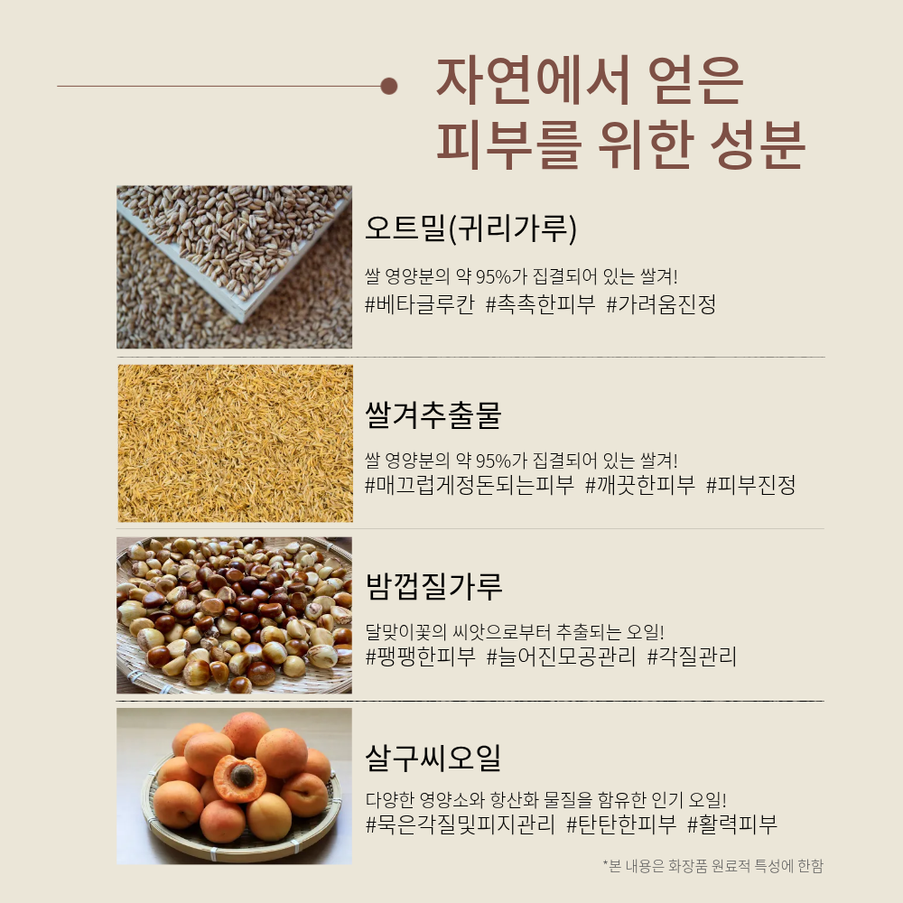 소듐코코일이세티오네이, 프로필렌글라이콜, 데실글루코사이드, 글리세린, 정제수, 살구씨오일, 오트밀, 밤껍질가루, 작약뿌리가루, 부틸렌글라이콜, 쌀겨추출물, 1,2-헥산다이올, 복령가루, 진주가루, 토코페릴아세테이트