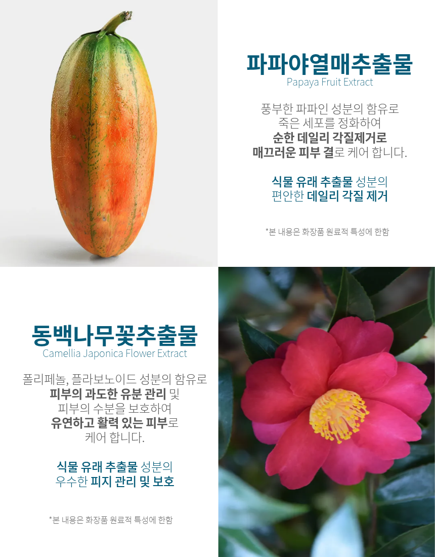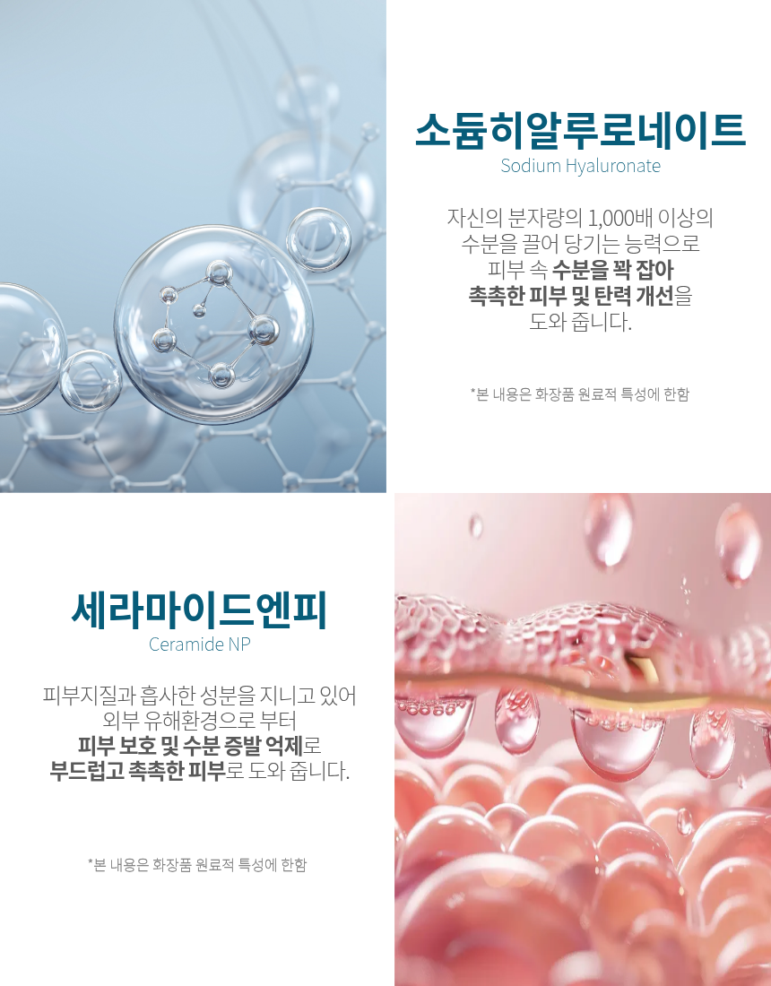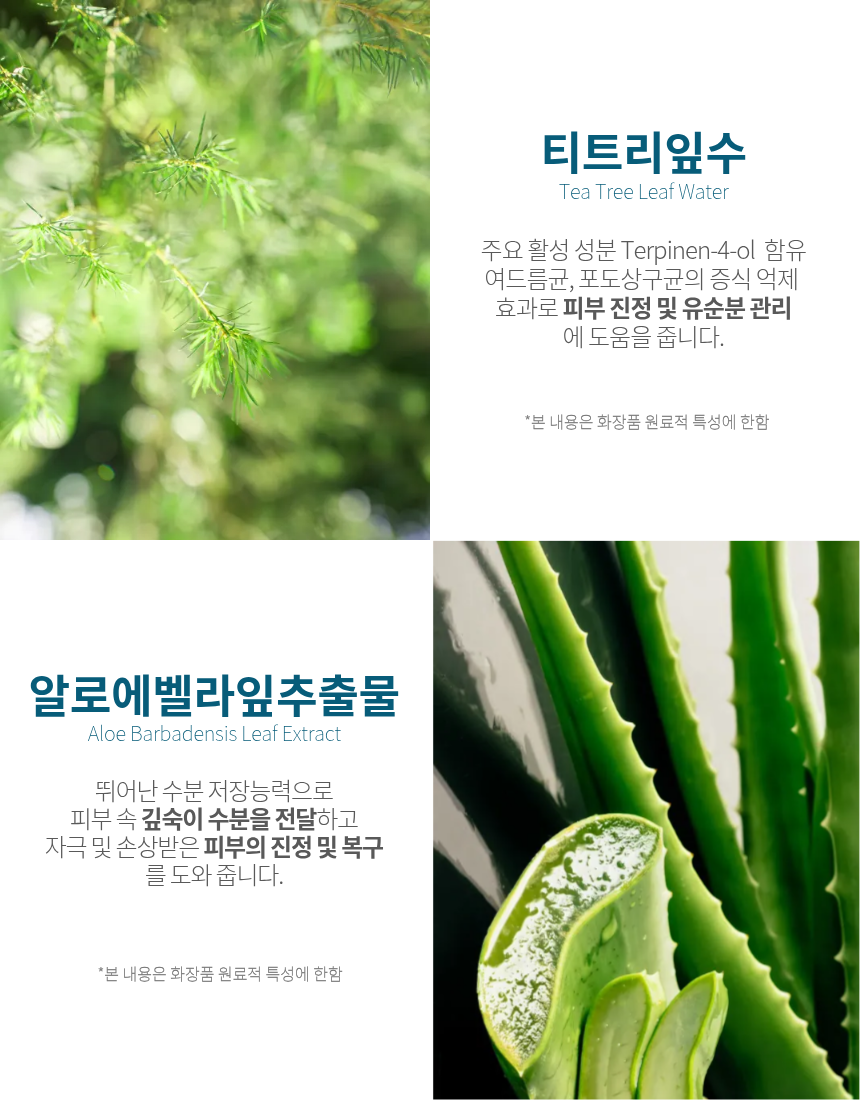 정제수, 다이프로필렌글라이콜, 부틸렌글라이콜, 나이아신아마이드, 베타인, 티트리잎수, 글리세린, 잔탄검, 글리세레스-26, 하이드록시아세토페논, 판테놀, 1,2-헥산다이올, 글리세릴글루코사이드, 카프릴릴글라이콜, 아데노신, 다이소듐이디티에이, 글루코오스, 타마린드씨검, 소듐폴리글루타메이트, 글리세릴아크릴레이트/아크릴릭애씨드코폴리머, 소듐하이알루로네이트, 피브이엠/엠에이코폴리머, 락토바실러스발효용해물, 백미꽃추출물, 서양민들레잎추출물, 에틸헥실글리세린, 세라마이드엔피, 알로에베라잎추출물, 파파야열매추출물, 동백나무꽃추출물