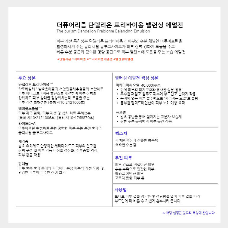 정제수, 다이프로필렌글라이콜, 마카다미아씨오일, 하이드로제네이티드폴리(C6-14올레핀), 세틸에틸헥사노에이트, 사이클로펜타실록세인, 글리세릴스테아레이트, 하이드로제네이티드레시틴, 1,2-헥산다이올, 판테놀, 글리세릴글루코사이드, 알로에베라잎즙, 세라마이드엔피, 칸디다/가르시니아발효물, 해바라기씨오일, 바이오사카라이드검-1, 락토바실러스발효용해물, 서양민들레잎추출물, 백미꽃추출물, 세테아릴알코올, 다이메티콘, 피이지-100스테아레이트, 글리세린, 카보머, 트라이에탄올아민, 부틸렌글라이콜, 에틸헥실글리세린, 카프릴릴글라이콜, 스테아릭애씨드, 잔탄검, 다이소듐이디티에이, 폴리글리세릴-10스테아레이트, 소듐스테아로일글루타메이트, 시트릭애씨드, 페녹시에탄올, 포타슘솔베이트, 소듐벤조에이트, 향료, 리날룰, 리모넨