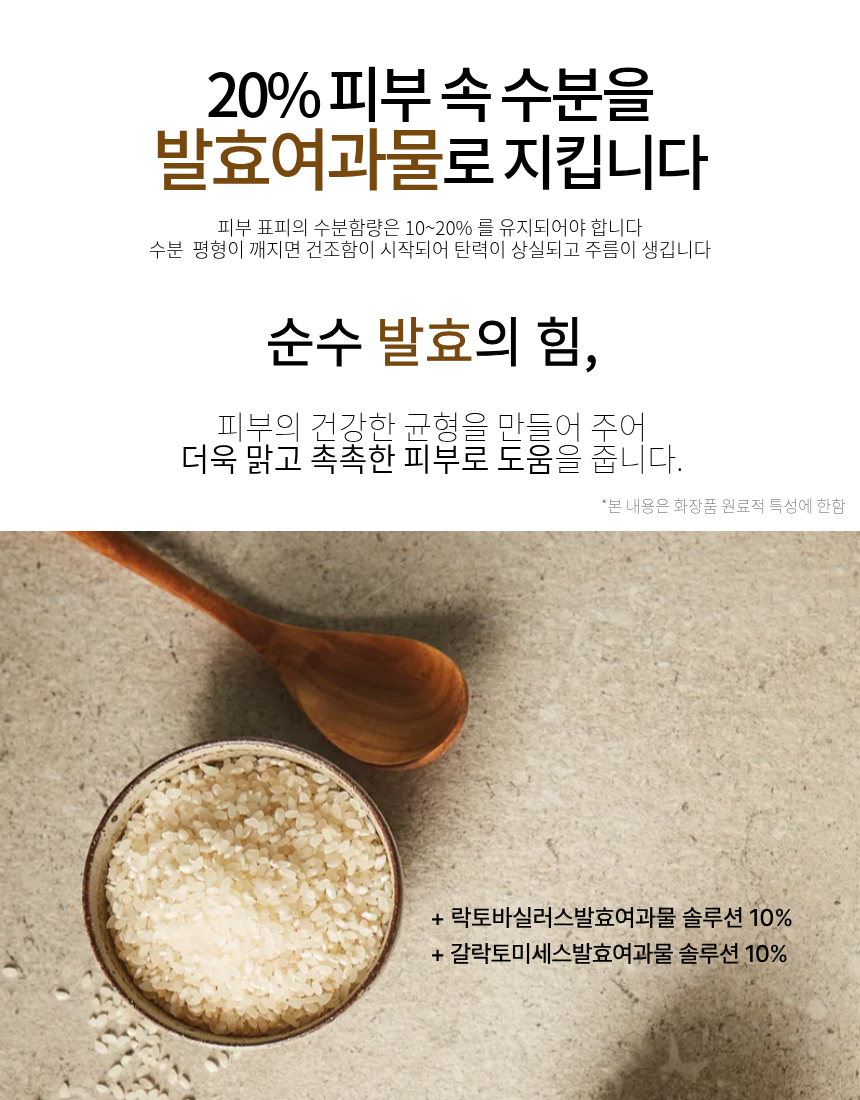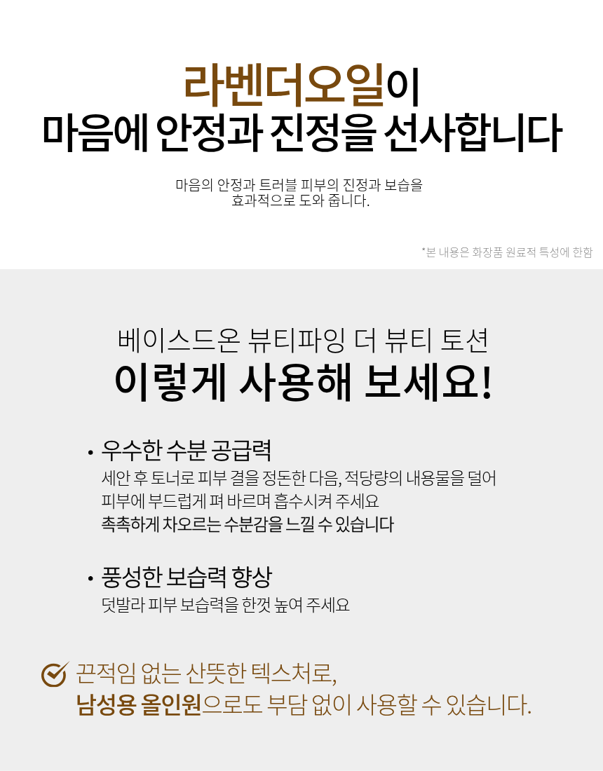 정제수, 락토바실러스발효여과물, 갈락토미세스발효여과물, 글리세린, 부틸렌글라이콜, 메틸글루세스-20, 나이아신아마이드, 글리세레스 -26, 1,2-헥산다이올, 올리브오일, C14-22알코올, 스쿠알란, 카프릴릴글라이콜, C12-20알킬글루코사이드, 카보머, 알지닌, 토코페롤, 암모늄아크릴로일다이메틸타우레이트/브이피코폴리머, 셀룰로오스검, 세테아릴알코올, 에틸헥실글리세린, 아데노신, 세라마이드엔피, 소듐하이알루로네이트, 라벤더오일, 글루코오스, 아시아틱애씨드, 아시아티코사이드, 마데카식애씨드